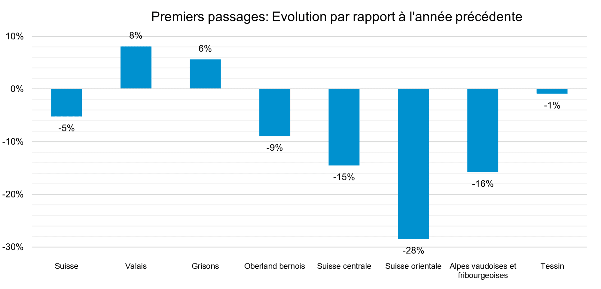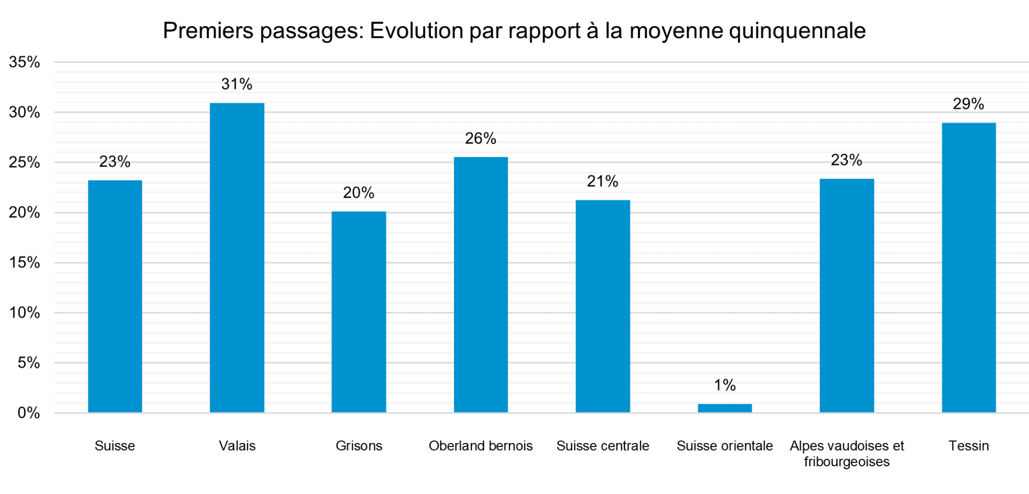 La situation difficile observée dans de nombreuses régions par rapport à l'année précédente change lorsque l'on compare le début de l'hiver actuel à une série chronologique plus longue. Par rapport à la moyenne sur cinq ans, l'hiver a été réussi (y compris un hiver marqué par le coronavirus). Ainsi, une augmentation de 23 % des premiers passages a été enregistrée par rapport à la moyenne sur cinq ans. Les taux de croissance varient également, allant de 1 % en Suisse orientale à 31 % en Valais (cf. fig. 4).