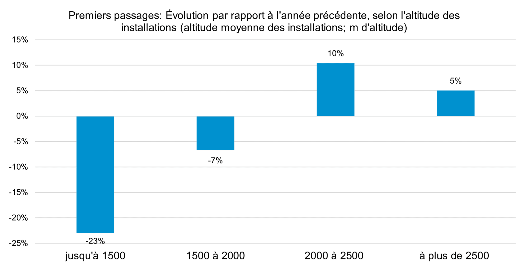 Une analyse du nombre de hôtes en fonction de l'altitude des domaines skiables confirme les prévisions : le début de saison a été particulièrement difficile pour les domaines situés à moins de 1500 m d'altitude, qui ont enregistré en moyenne 23 % de visiteurs en moins par rapport au début de saison 2024/25, exceptionnellement enneigé. Les domaines situés entre 1500 et 2000 m d'altitude ont enregistré une baisse de 7 %, tandis que ceux situés au-dessus de 2000 m ont accueilli encore plus de visiteurs que l'année précédente (cf. fig. 2).