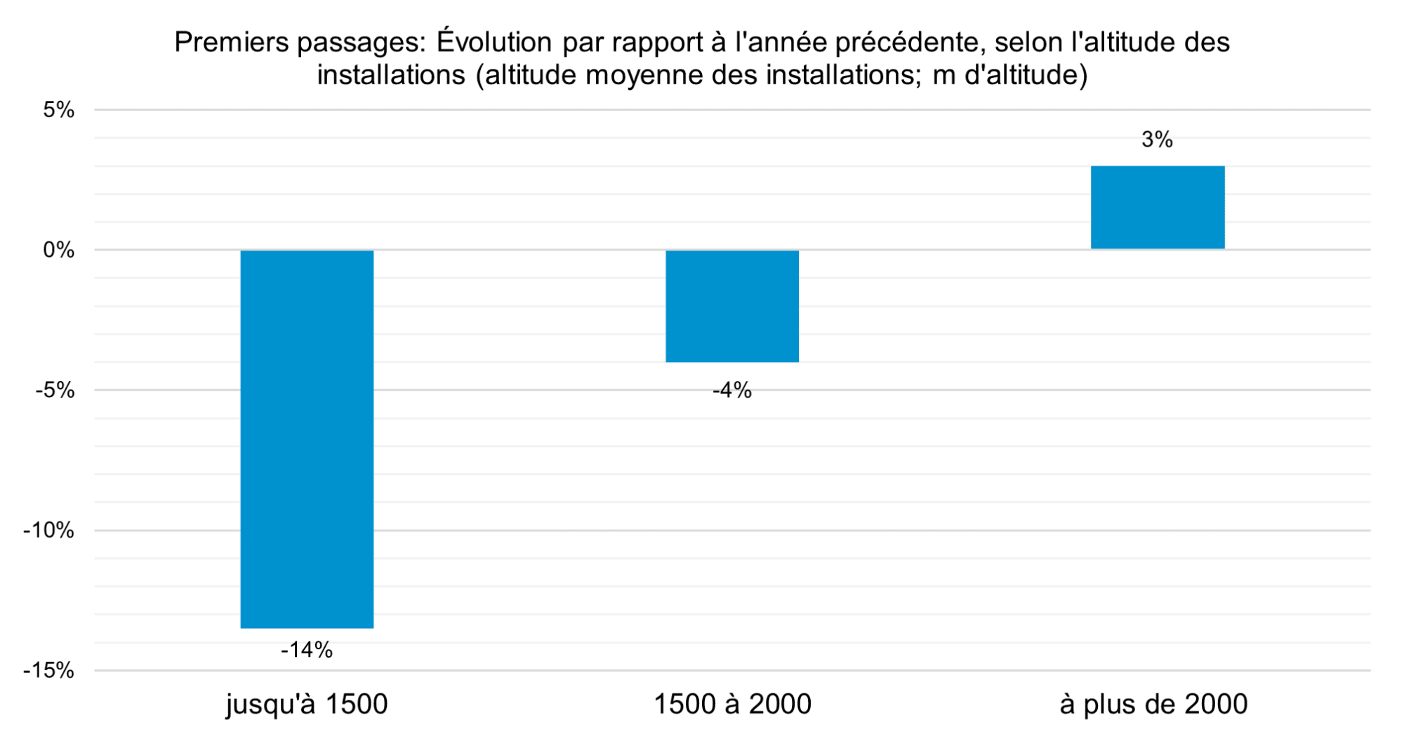 L’analyse du nombre de visiteurs en fonction de l’altitude des domaines skiables confirme les prévisions : le début de saison a été particulièrement difficile pour les domaines skiables situés à moins de 1500 mètres d’altitude, qui ont enregistré en moyenne 14 % de visiteurs en moins par rapport à la même période de l’hiver 2024/25, exceptionnellement enneigé. Les domaines skiables situés entre 1500 et 2000 mètres d’altitude ont enregistré une baisse de 4 %, tandis que les destinations situées au-dessus de 2000 mètres d’altitude ont même enregistré une augmentation du nombre de visiteurs par rapport à l’année précédente (cf. fig. 2).