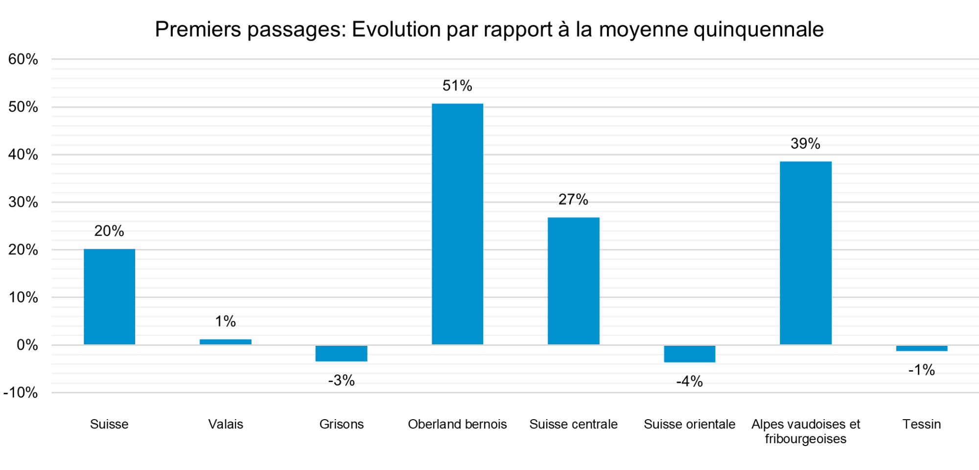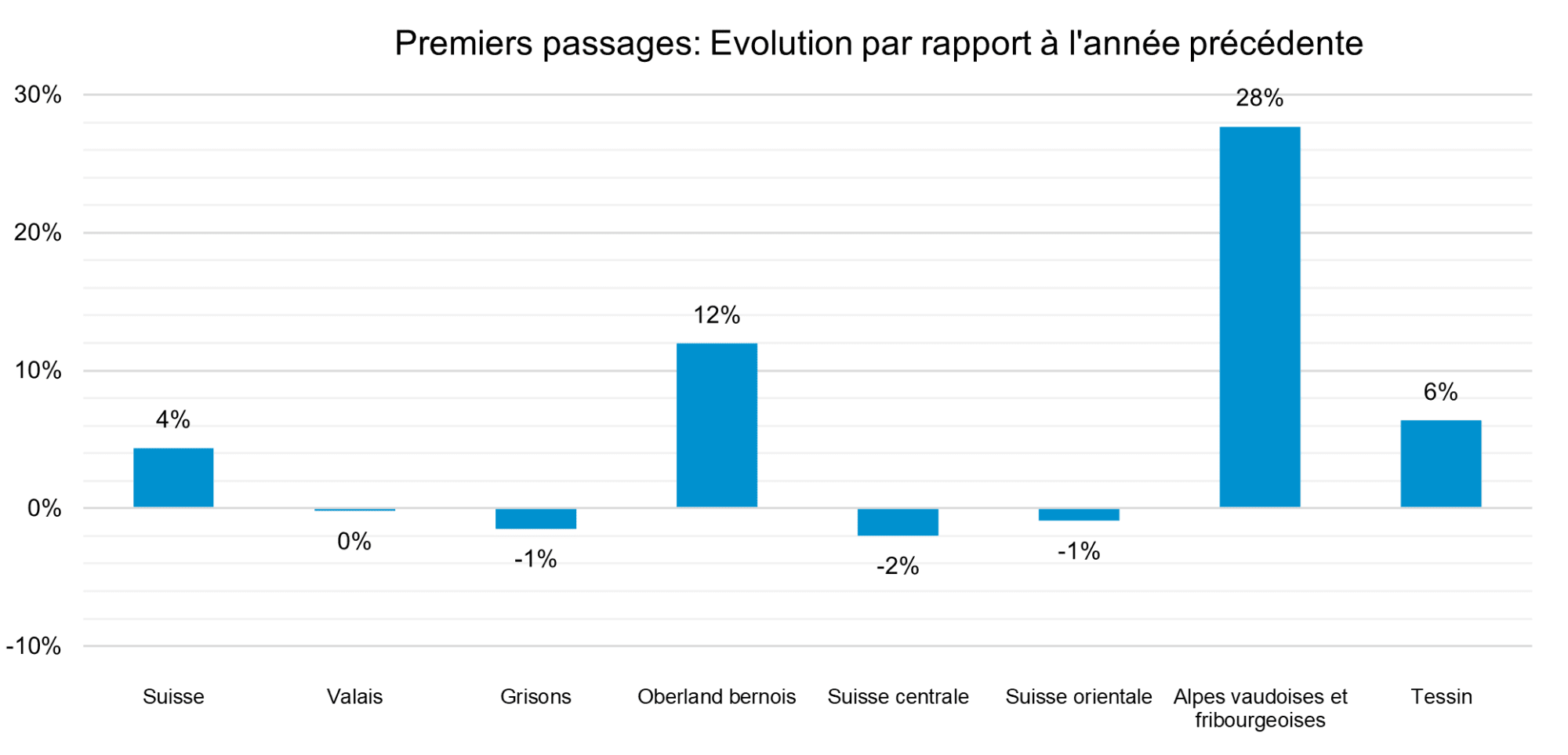 Ein Blick in die jeweiligen Gebiete zeigt regionale Unterschiede und Besonderheiten auf. Den grössten Zuwachs können wiederum die Waadtländer und Freiburger Alpen vermelden (+22 %), das Berner Oberland folgt mit 17 % an zweiter Stelle, gefolgt vom Wallis mit 13 %. Die weiteren Regionen haben alle einen positiven einstelligen Prozentwert (vgl. Abb. 1).
