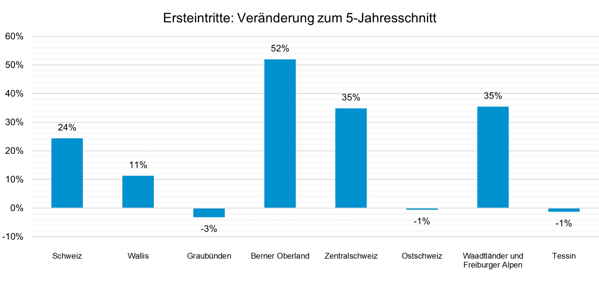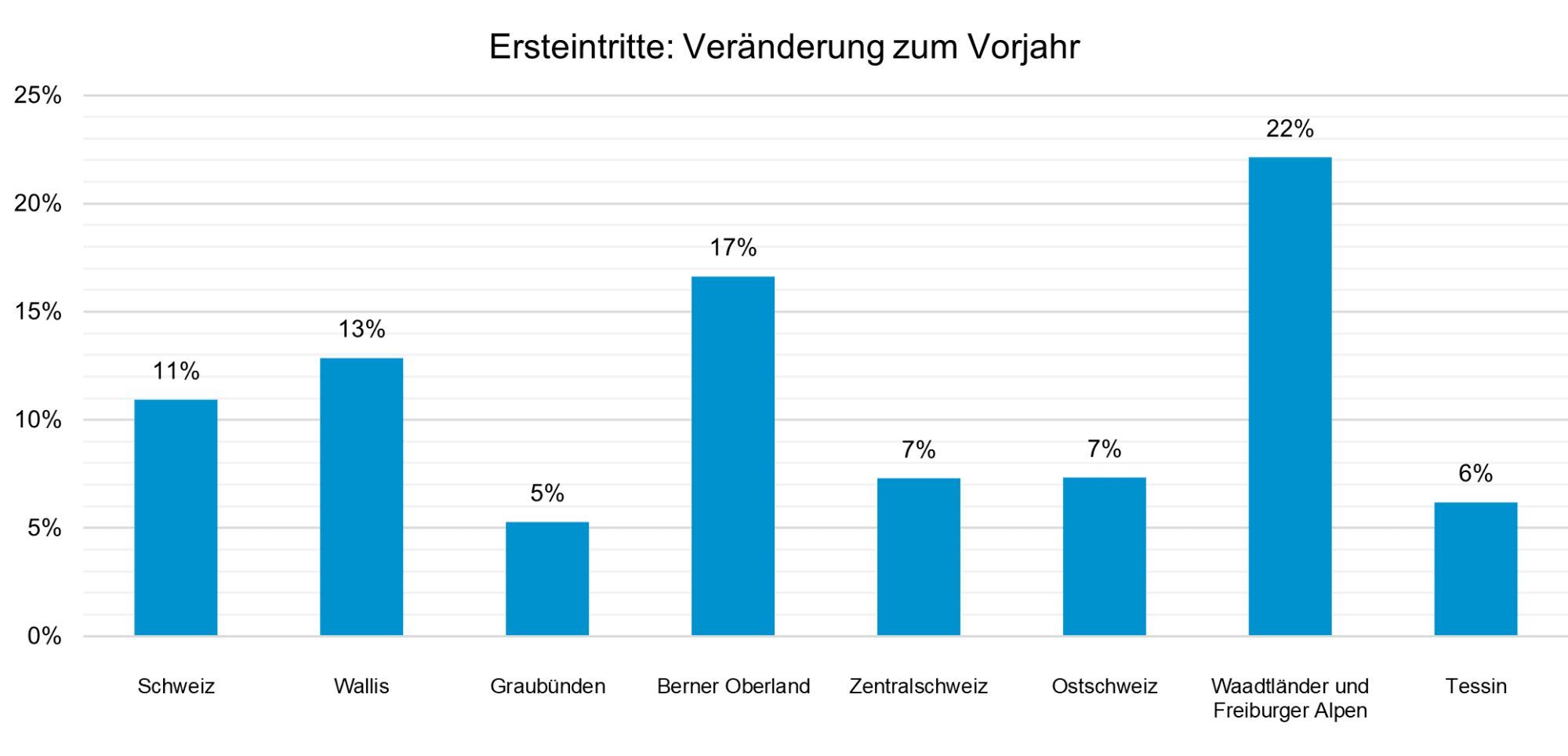 Ein Blick in die jeweiligen Gebiete zeigt regionale Unterschiede und Besonderheiten auf. Den grössten Zuwachs können wiederum die Waadtländer und Freiburger Alpen vermelden (+22 %), das Berner Oberland folgt mit 17 % an zweiter Stelle, gefolgt vom Wallis mit 13 %. Die weiteren Regionen haben alle einen positiven einstelligen Prozentwert (vgl. Abb. 1).
