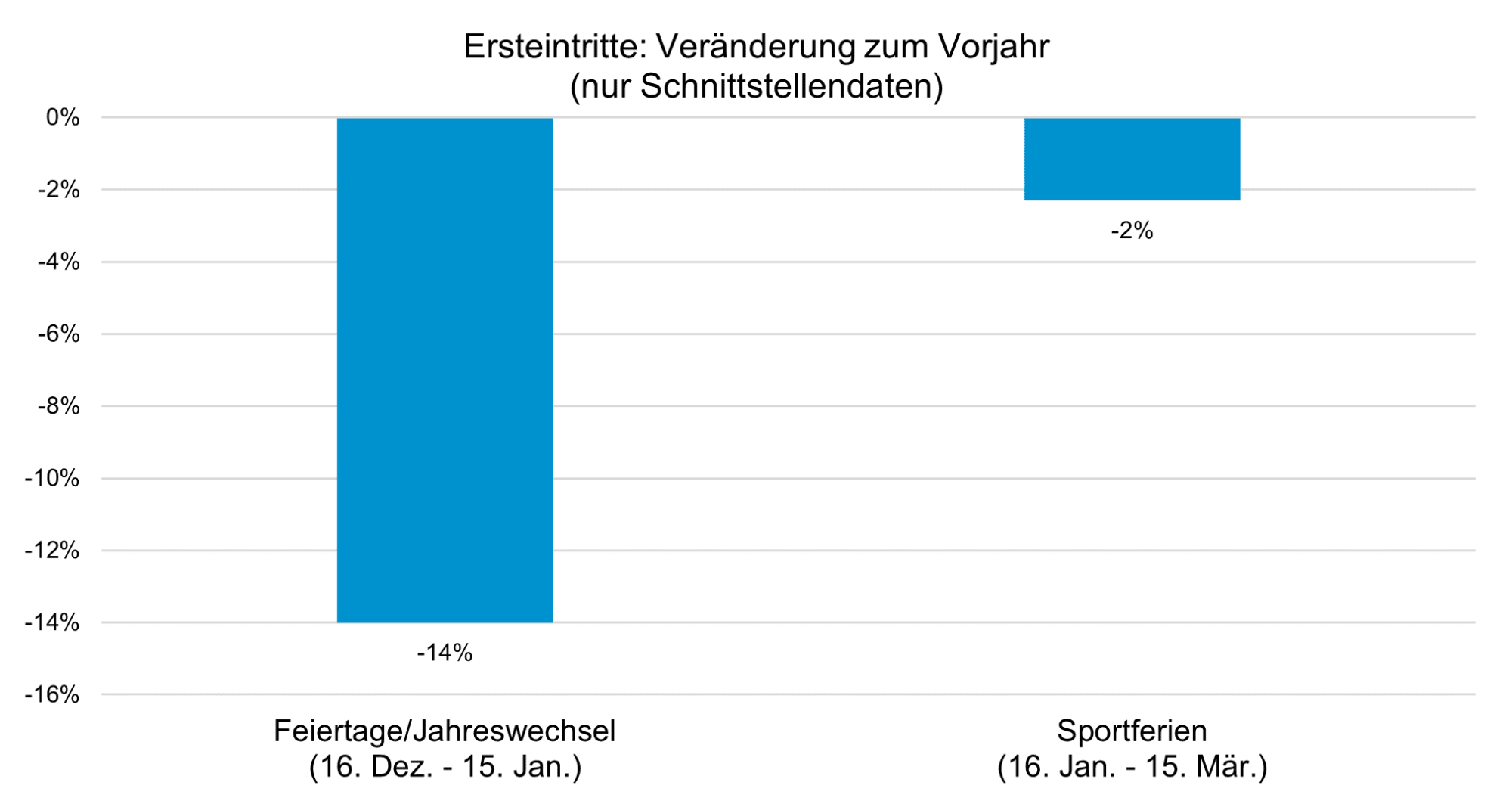 Die tagesgenaue Erhebung der Gästezahlen bei einem Grossteil der Destinationen mit entsprechenden Zutrittssystemen erlaubt es dem Verband, Saisonabschnitte zu definieren. Hier zeigt sich, dass in der Sportferienzeit – zwischen Mitte Januar und Mitte März – der Rückgang der Gästezahlen mit -2 % geringer war als während der Feiertage und dem Jahreswechsel, wo der Rückgang -14 % betrug (vgl. Abb. 1).