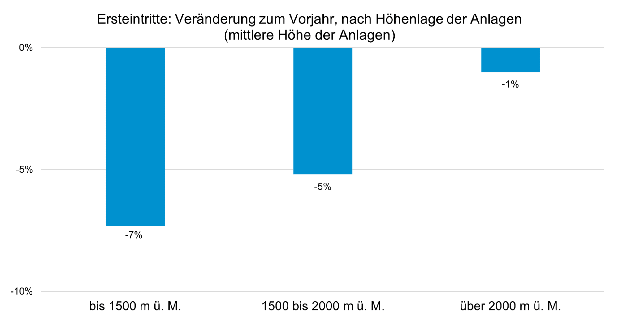 Die Auswertung der Gästezahlen nach Höhenlage für die bisherige Saison bestätigt das erwartete Bild: Besonders anspruchsvoll verlief der Winter bisher für Gebiete unter 1’500 m ü. M. Sie verzeichneten im Durchschnitt 7 % weniger Gäste als in der Vergleichsperiode. Gebiete in mittleren Lagen zwischen 1’500 und 2’000 m ü. M. registrierten ein Minus von 5 %. Destinationen oberhalb von 2’000 m ü. M. bleiben 1 % hinter den Gästezahlen zum Vorjahr zurück (vgl. Abb. 2).